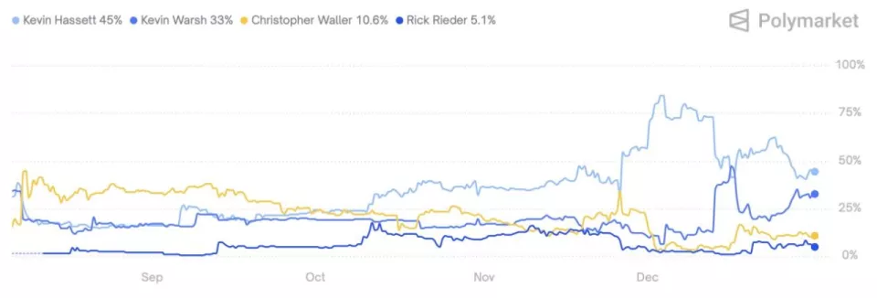 截至12月底,主流预测平台数据显示,哈塞特与沃什的隐含胜率在35%至50%的狭窄区间内反复胶着,差距微乎其微。这场角逐,似乎演变为哈塞特所代表的“白宫可控性”与沃什所象征的“市场可信度”之间的直接较量。