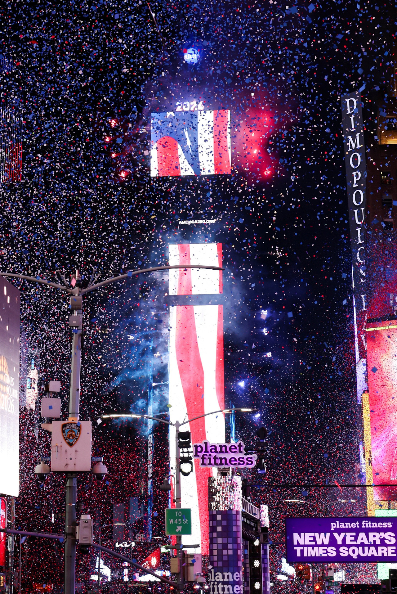 今年跨年正好是美国庆祝建国250周年,红蓝白星条旗成为主视觉。(路透)