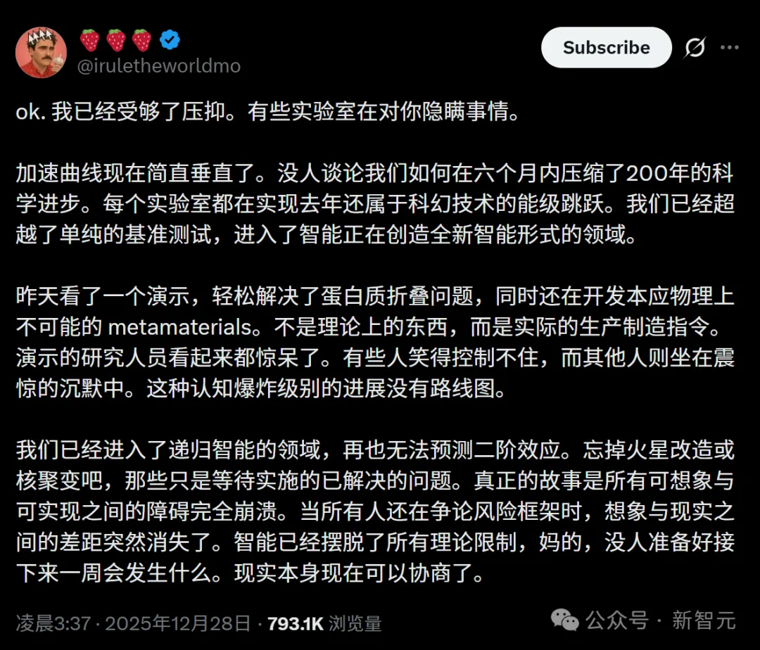 现在,每个实验室都在实现去年看来还是科幻的能级跳跃。可以说,我们已经超越了单纯的基准测试,进入了智能创造全新智能形式的领域。