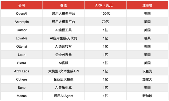 把 Manus 放进一个更大的参照系中,答案会变得更清晰。放眼全球,目前已被广泛确认 ARR突破1亿美元的 AI 应用公司包括:OpenAI、Anthropic、Cursor、Lovable、Otter.ai、Glean、Sierra、AI21 Labs、Cohere、Suno,以及 Manus。