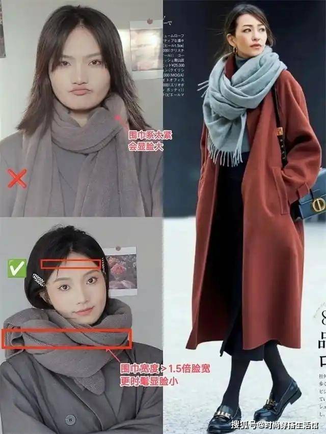 其实冬天很多人都会有一种通病,就是喜欢把围巾系得很紧很紧,以为选择这样的穿搭就会很暖和,其实对于冬季来说并不是这样的,我们选择的围巾如果系得太紧的话就会显得我们脸大,而且上身搭配的舒适度也会降低,最好的建议就是围巾的>1.5倍脸宽,这样所呈现出来的效果就会时髦显脸小。