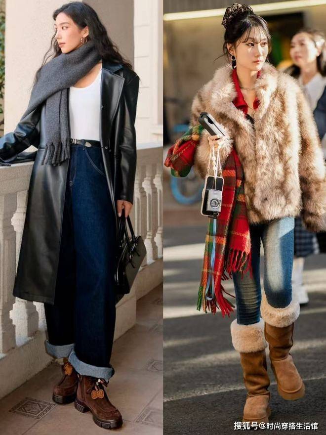而脚踝和脖子一样,同样是血管丰富的关节部位,秋冬裹紧脚踝就会暖和不少。和戴围巾一样,上海妈妈们裹脚踝的穿法也不少~ 最常见的方式是用紧身裤和长袜裹脚踝,但此种穿法一定要塑造出“落差感”。像右边这样打底裤和靴子颜色、松紧都太接近,搭配就太死板。