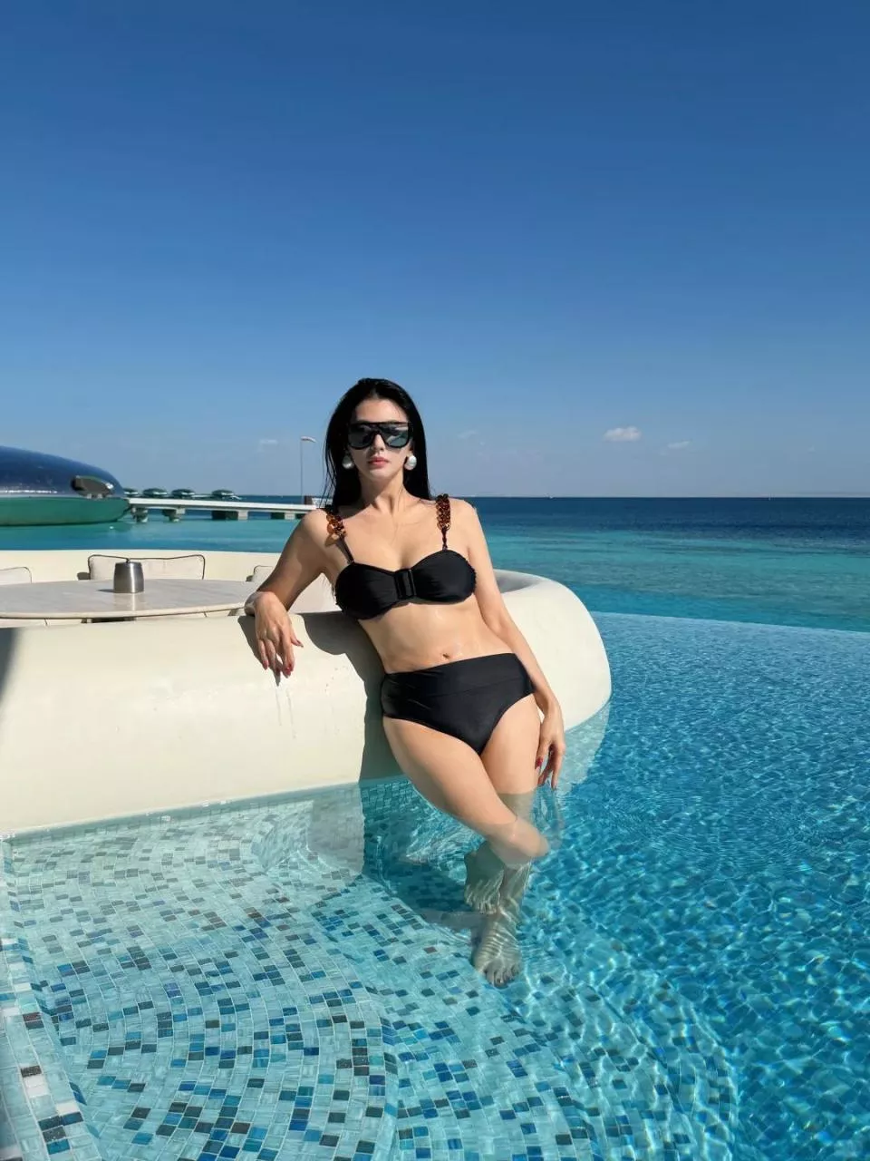 可转头换身黑色比基尼,画风立刻反转:湿发贴头皮配大墨镜,小麦色皮肤在阳光下泛着健康光泽,往泳池边一靠仰着头晒太阳,蚂蚁腰配蜜桃臀,1米6的大长腿直晃眼,妥妥的冷艳御姐气场。