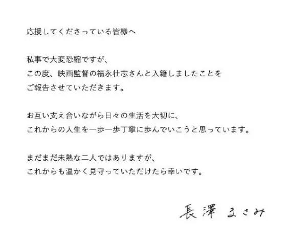 在此向大家报告,我已与电影导演福永壮志先生正式登记结婚,今后我们会彼此扶持,珍惜每天的生活,一步一步、踏踏实实地走好接下来的人生。