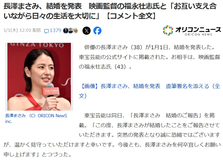 2026年1月1日,38岁的长泽雅美通过东宝艺能官网发布声明,宣布与43岁的电影导演福永壮志登记结婚。