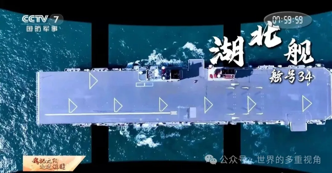 字幕写的是“湖北舰,舷号34”,配的画面却是076。