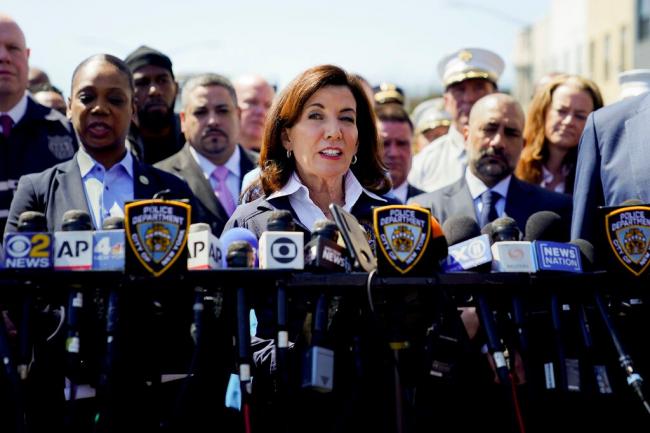 纽约市一名枪手12日早上于地铁车厢内触发烟雾弹后开火,纽约州长霍楚尔(Kathy Hochul)到场关切并且召开记者会。(美联社)