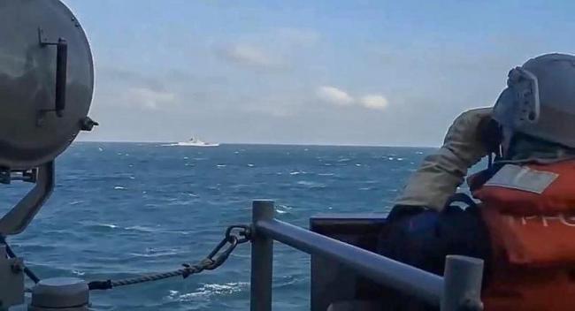 解放军东部战区在台湾周边海空域举行“正义使命-2025”军事演习,台国防部发布在海上近距离监控安阳舰的画面。(图/国防部提供)
