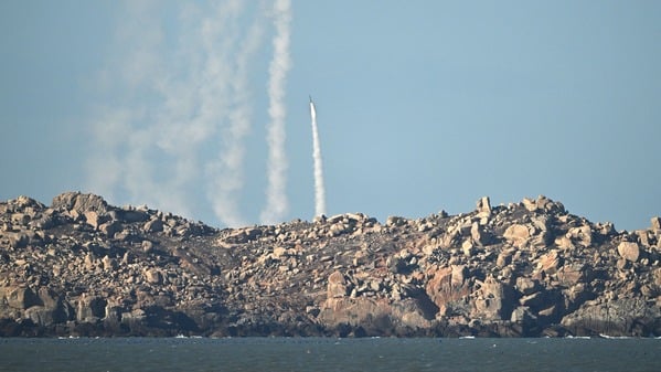 2025年12月30日,共军在福建省平潭岛(距离台湾最近之地)进行军事演习时,向空中发射火箭。(图片来源:ADEK BERRY/AFP via Getty Images)