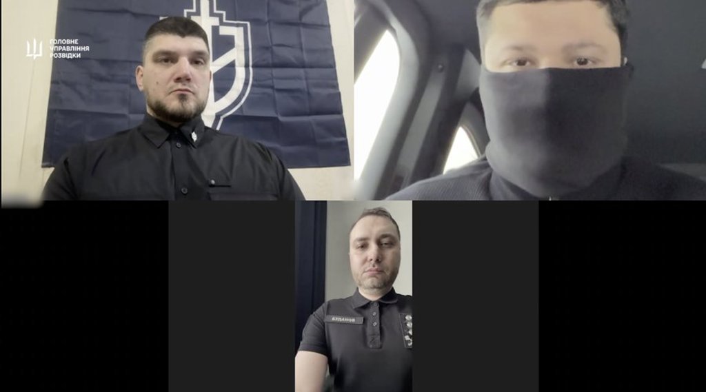 乌克兰军情局局长布达诺夫(下),帖木儿特种部队指挥官(右上幪面者)与俄罗斯志愿军团首领卡普斯汀(左上)举行庆功线上会议,卡普斯汀在前几天传出战死,而他现在「重返人间」。(图/X)