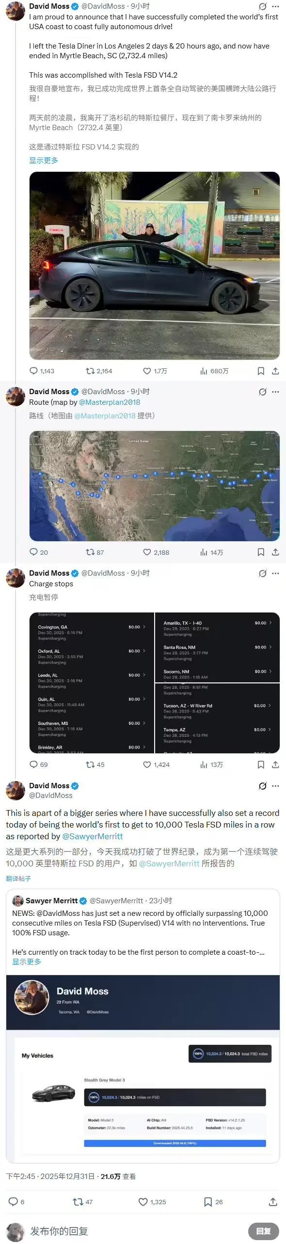 “这是由特斯拉 FSD V14.2 完成的,全程没有任何形式的干预,包括在所有停车场,甚至在特斯拉超级充电站停车时也是如此。”莫斯随后在评论中补充说,此次旅途中没有任何惊险情况发生。