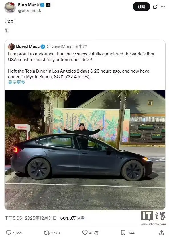 特斯拉北美官方账号同样发文庆祝:“首辆在 FSD 监督下自主完成东西海岸行驶的特斯拉。全程 FSD,0 干预。”