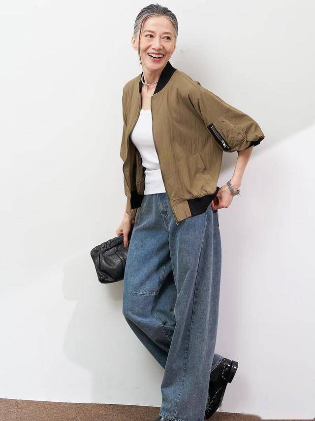 短款夹克外套,下摆收紧好显瘦,内搭修身T恤,配合上垂感十足的牛仔裤,减龄10岁不止。