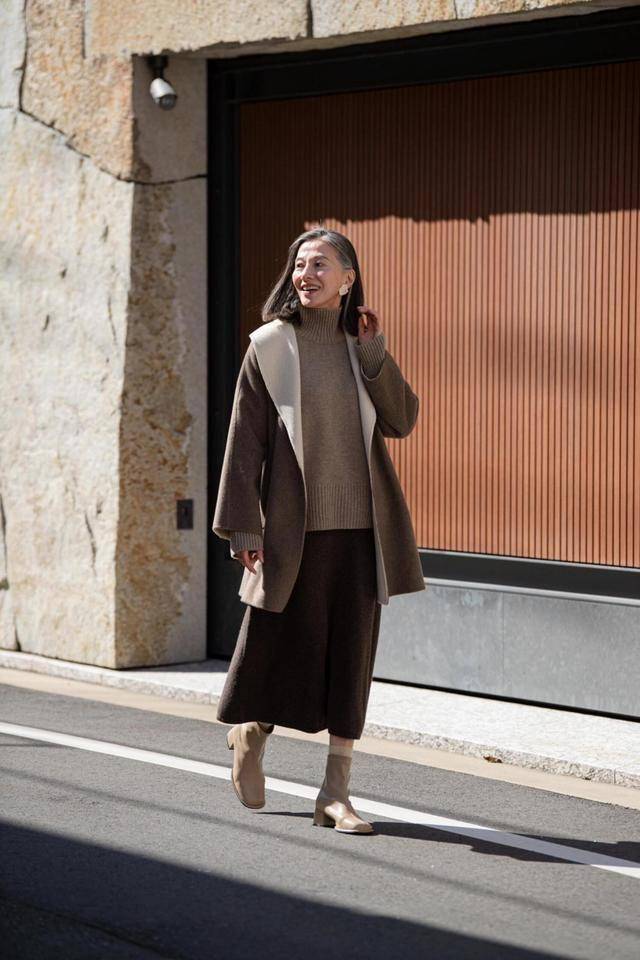借助大翻领优化头肩比,利用同色系,化解割裂感,一切都如此美好和谐。