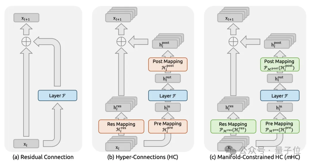近期出现的Hyper-Connections(HC)试图打破这一格局。HC将残差流的宽度从C维扩展到n×C维,并引入三个可学习的映射矩阵来管理信息流动。