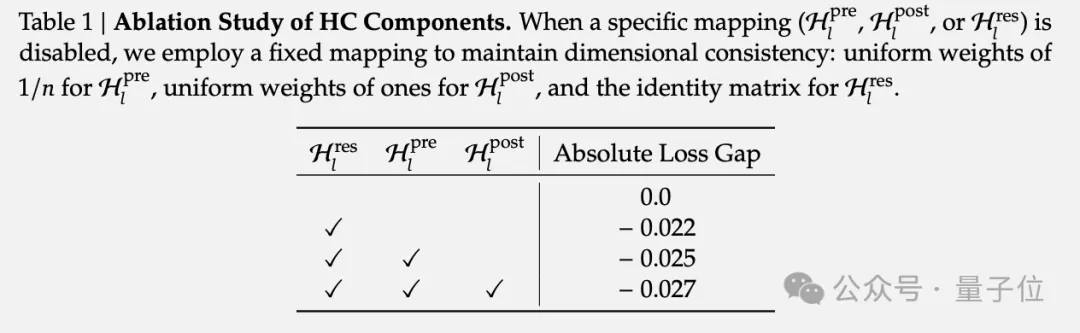 DeepSeek团队的实验表明,在这三个映射中,负责残差流内部信息交换的Hres矩阵贡献了最显著的性能提升。