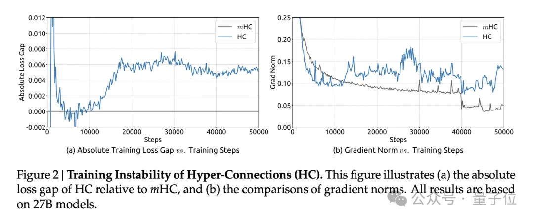 论文中展示的27B模型训练曲线显示,HC在约12000步时出现了突发的损失激增,梯度范数也表现出剧烈波动。