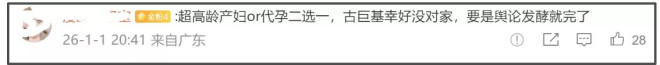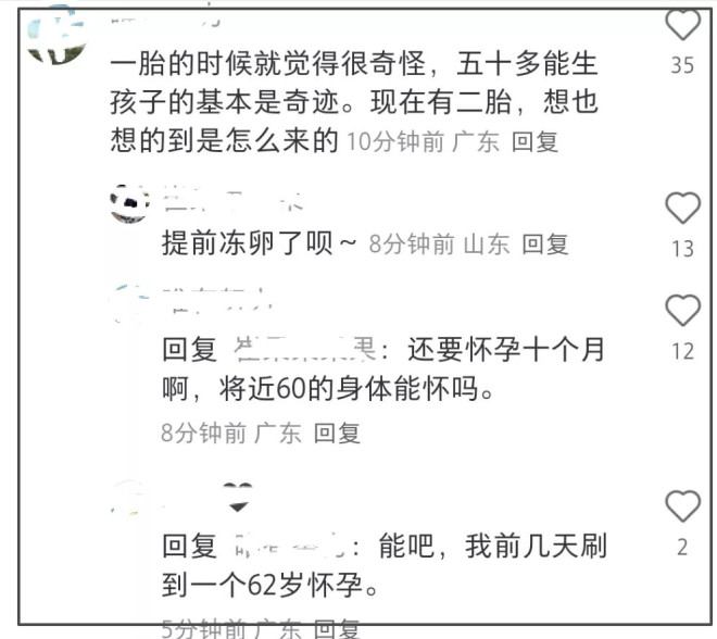 还有网友对57岁生孩子存疑,觉得生第一胎的时候就觉得奇怪,50多岁能生孩子是奇迹,有网友觉得应该是冻卵了,但是冻卵也要亲自怀才行,甚至有不少网友猜测可能是代孕的,感叹幸好古巨基没对家,不然这舆论发酵得翻大车。代孕在我国属于违法行为,所以还是希望网友理性看待和吃瓜。