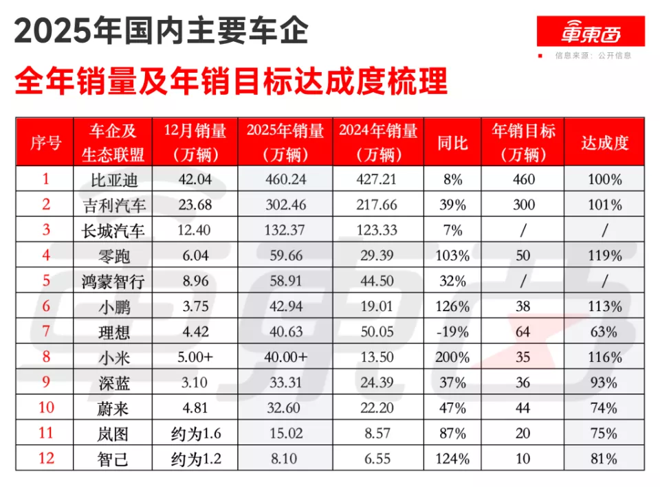 5家车企笑到最后,圆满达成2025年全年销量目标,他们分别为比亚迪、吉利、零跑、小鹏、小米。