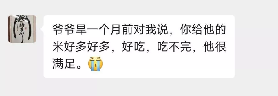 中秋节的时候过去看爷爷,当时老公不仅准备了红包,还强烈要求去超市买了很多袋米带过去给老人家。一个多月后爷爷因为甲流去世了,看到叔叔给我发的这段话哭得不能自已。