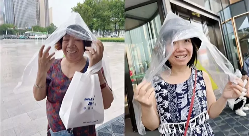 大雨,妈妈和我被困在商场里,雨伞售罄,雨衣很贵。雨小了一些,妈妈找了两个塑料袋,说就这样顶在头上走吧,我俩像扶着头纱,高高兴兴地回家了。