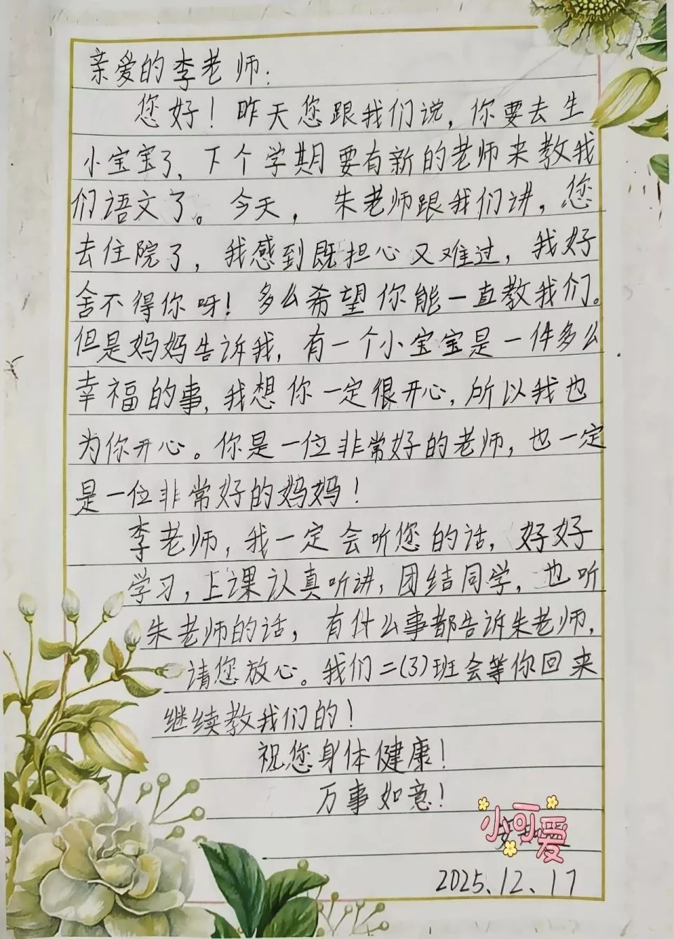 上班上到39w,入院待产时,收到学生的手写信。「我想你一定很开心,所以我也为你开心。」