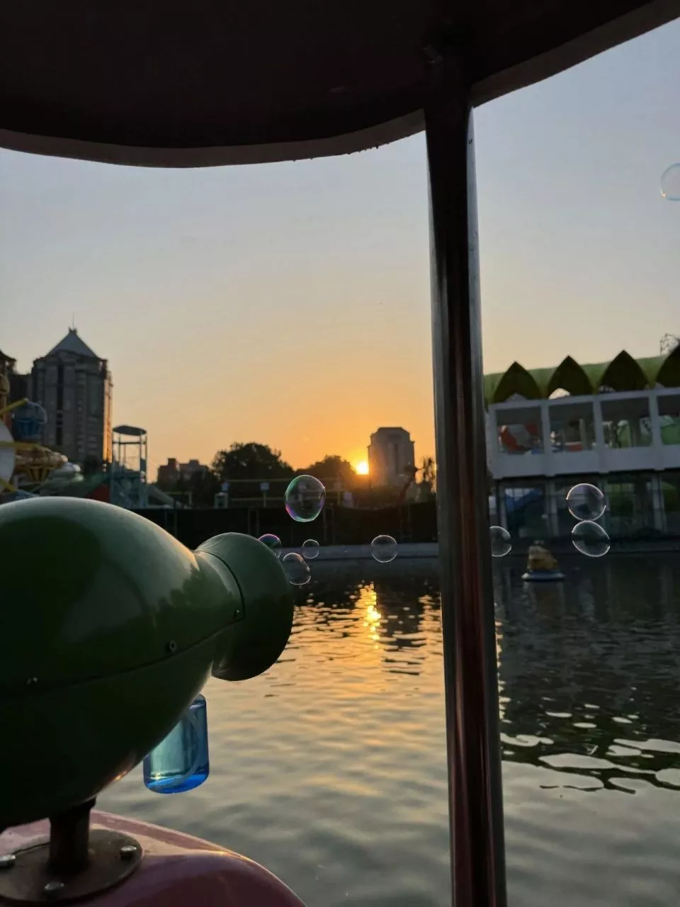 一直想和他一起划船,但是因为各种原因,在3个城市,总是没能实现。那天我们去吃了一家朋友推荐的小店,吃完后散步到了团结湖,在距离售票截止前5分钟,我们坐上了船。于是一个期待很久的愿望以平常的方式实现了,夕阳下,泡泡前。