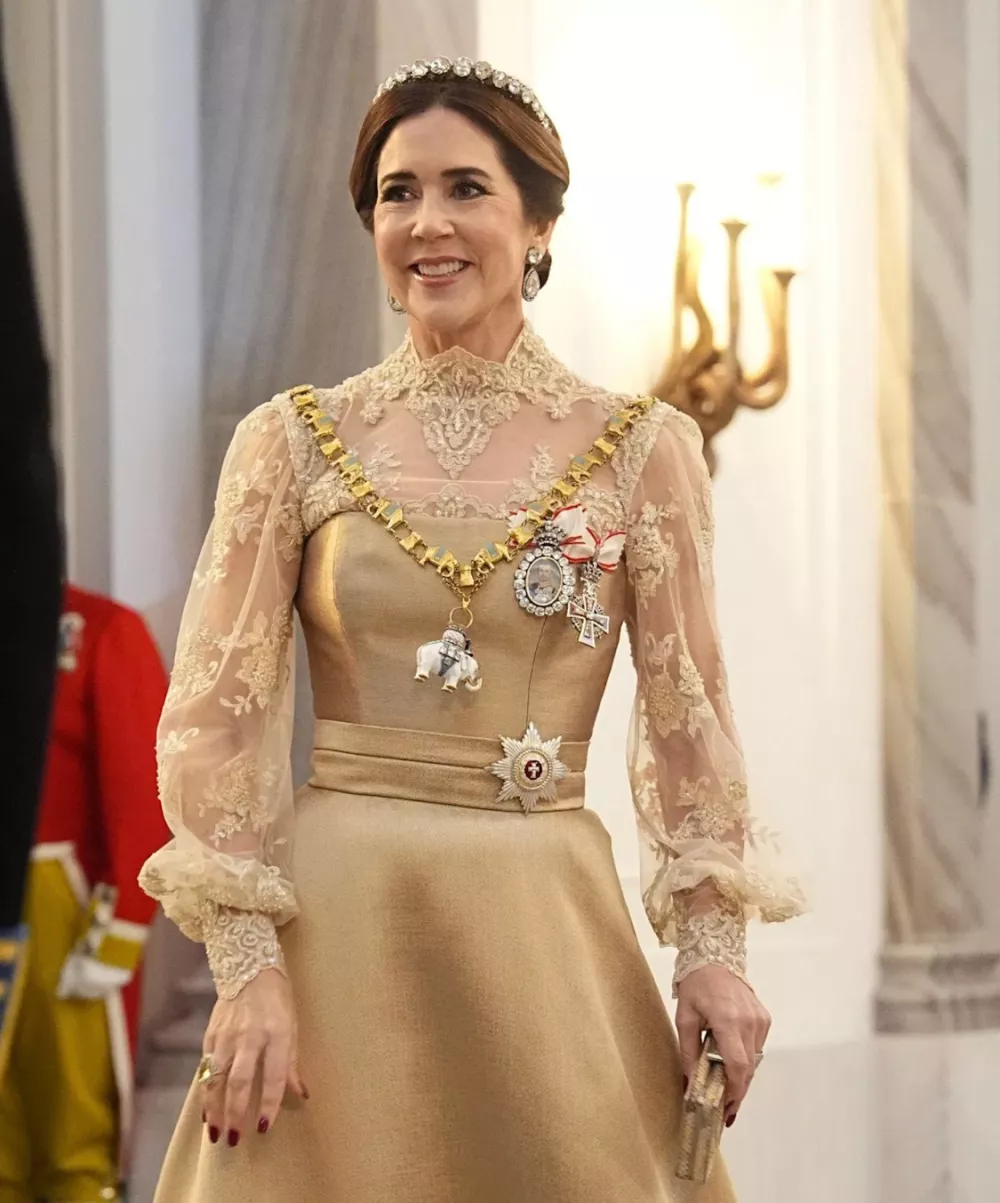现年53岁的玛丽王后,以一袭米色蕾丝长裙惊艳亮相,成为全场当之无愧的女主角。