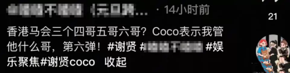 算起来谢贤和Coco已经分手七八年了,本以为两人应该再无交集了。没想到Coco又在社媒账号自曝往日的私密事。