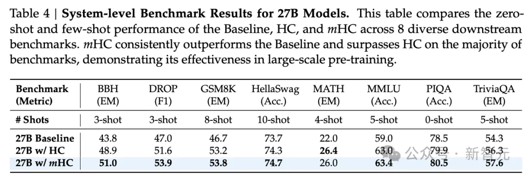 在27B模型的系统级基准测试结果中,新架构mHC在绝大多数基准测试中持续超越基线模型并优于HC,这证明其在大规模预训练中的有效性。