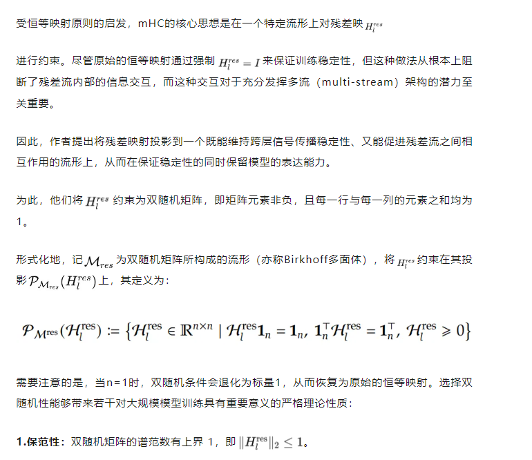 而mHC的思路是:将Hyper-Connections的参数空间约束到特定的流形(manifold)上,以恢复恒等映射结构。