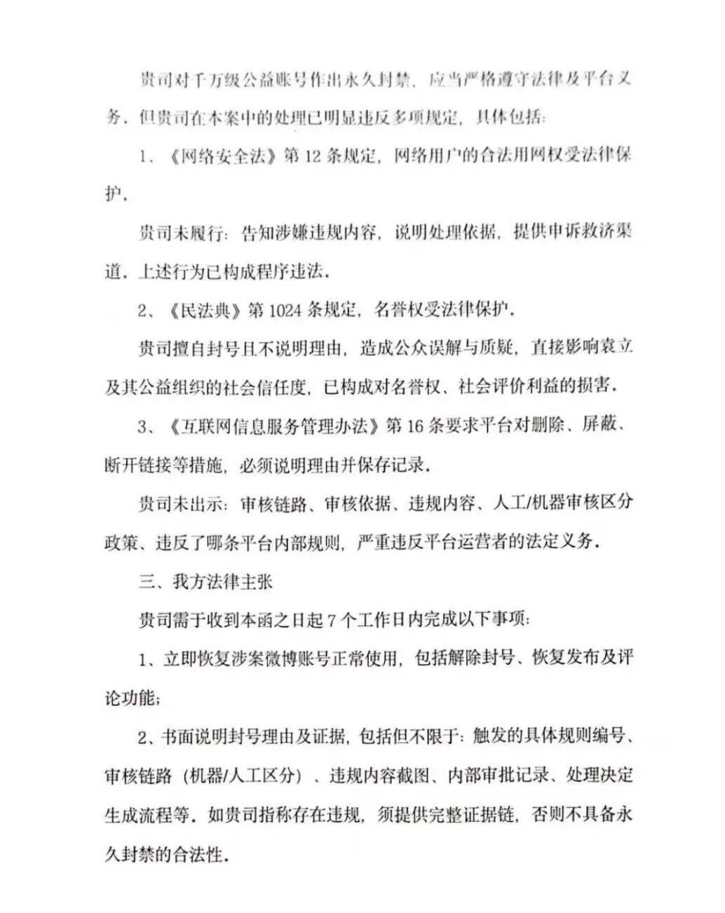 袁立控诉微博封禁没有遵守法律依据,她主张立即恢复微博账号正常使用,还要书面说明封号理由及证据,否则不具备永久封禁的合法性。