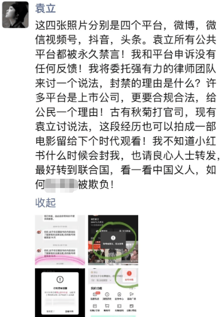 此外,袁立还发朋友圈提到了其他几个平台。她说古有秋菊打官司,现有袁立讨说法,请良心人士转发,最好转到联合国,看一看自己如何被欺负。