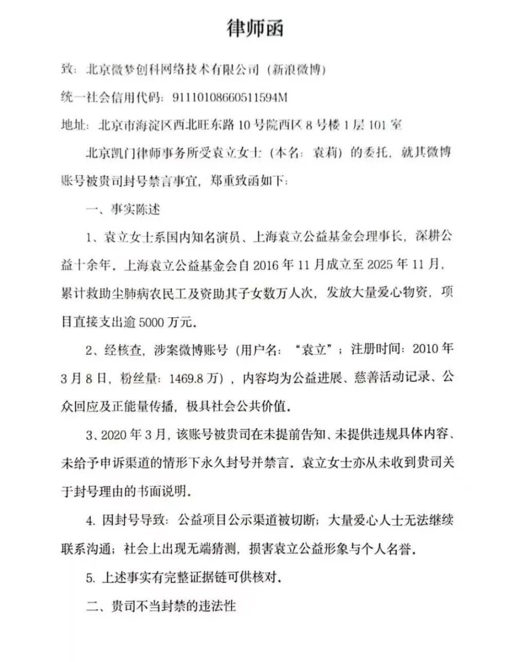 据网传律师函显示,袁立称自己微博账号有着1469.8万粉丝,账号被封禁后公益基金会受到严重影响,大量爱心人士无法联系沟通,损害了她公益形象和个人名誉。