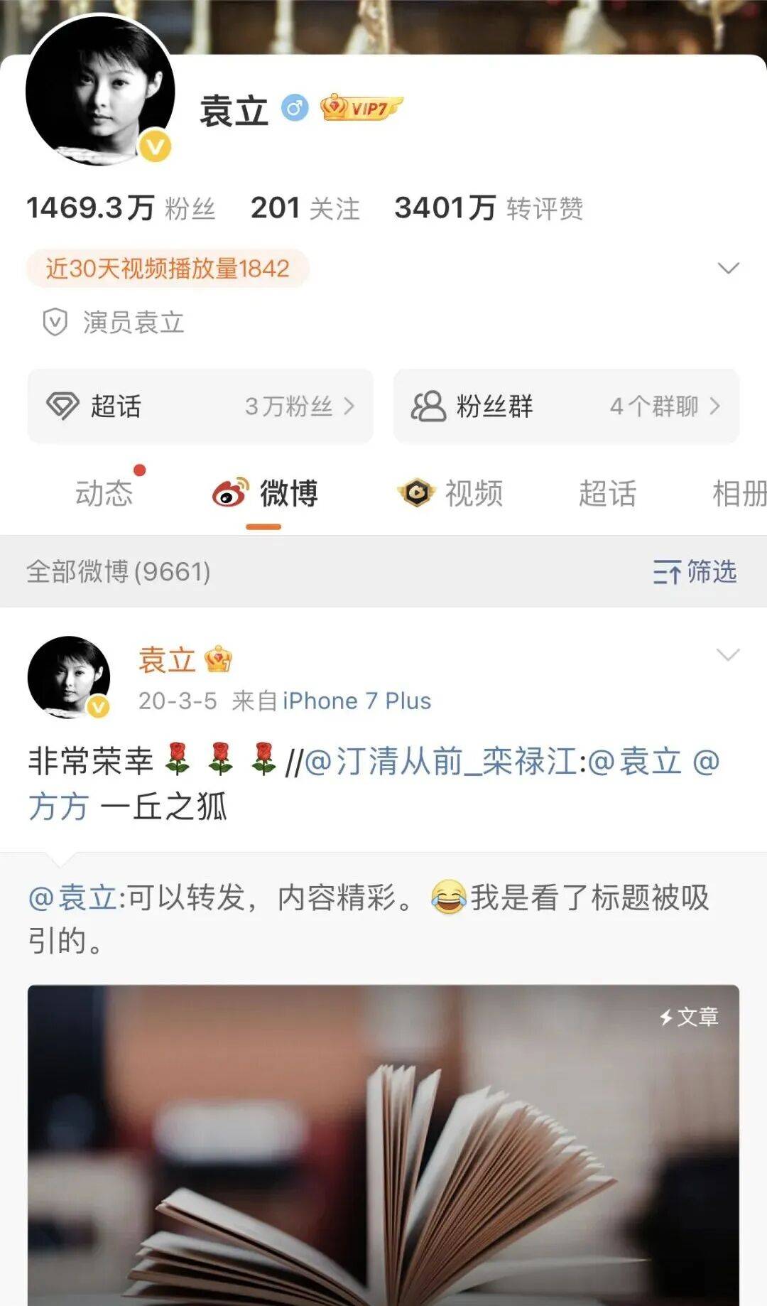 翻看袁立最新的微博,最新一条动态是2020年3月,之后再无任何动态。