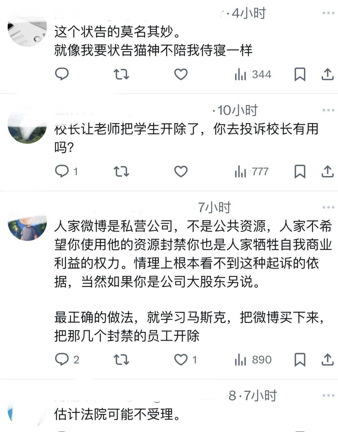袁立起诉一出,不少网友纷纷吐槽:“这个状告的莫名其妙,估计法院不受理”“校长让老师把学生开除,你去投诉校长有用吗?”“微博是私营公司,有本事学马斯克把微博买下来,开除那几个封禁账号的员工。”