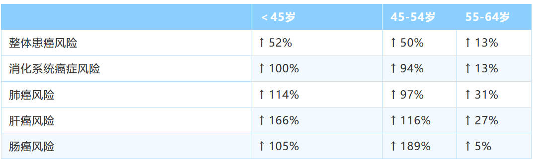 其中在<45岁、45-54岁和55-64岁时确诊脂肪肝的人,患癌风险都有所增高,且不同癌症风险增高有所不同——