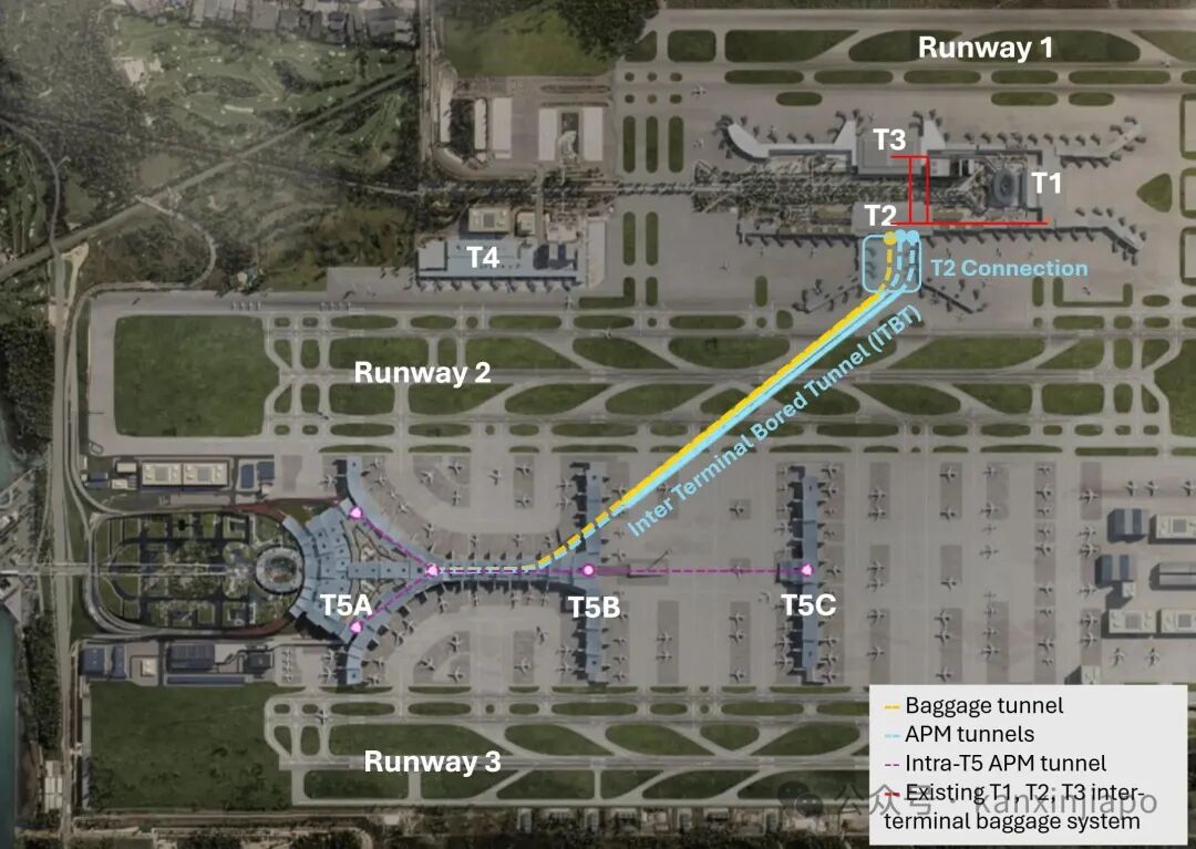 这次建好的其实不是一条隧道,而是三条并行的地下通道:1 条:专门用来运送行李2 条:供旅客自动捷运系统(类似机场 Skytrain,但在地下跑)