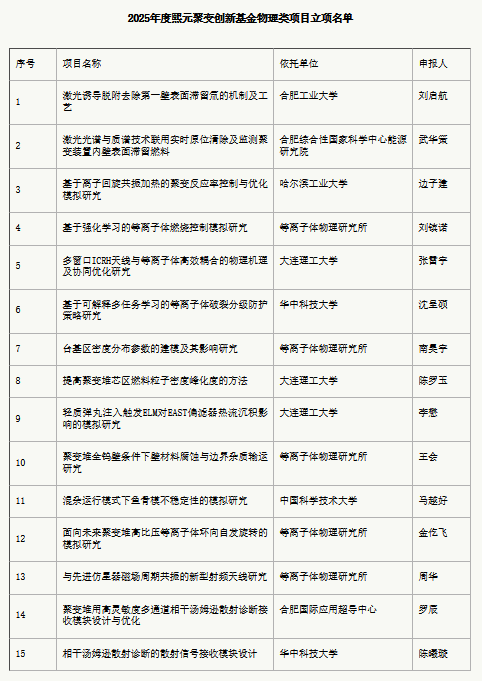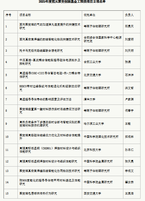2025熙元聚变创新基金项目立项名单揭晓中科院合肥等离子体研究所