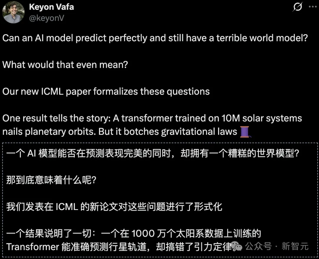Keyon Vafa和合作者的研究表明,Transformer并不会自然地学出牛顿式的世界模型。