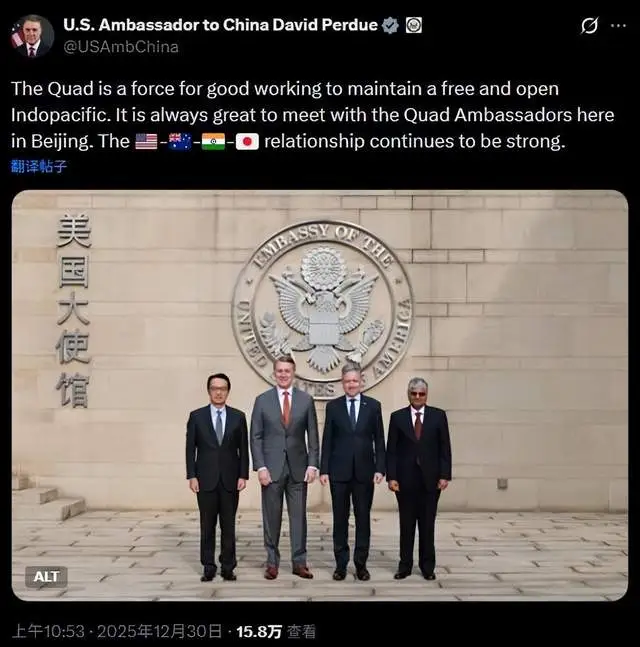 据报道,美国驻华大使庞德伟在北京的使馆内,召集了澳大利亚、印度和日本三国驻华大使,高调举行了一场“四方安全对话”(Quad)大使级会议。