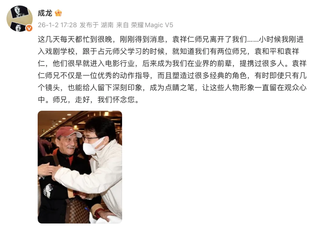成龙发文悼念:这几天每天都忙到很晚,刚刚得到消息,袁祥仁师兄离开了我们……小时候我刚进入戏剧学校,跟于占元师父学习的时候,就知道我们有两位师兄,袁和平和袁祥仁,他们很早就进入电影行业,后来成为我们在业界的前辈,提携过很多人。袁祥仁师兄不仅是一位优秀的动作指导,而且塑造过很多经典的角色,有时即使只有几个镜头,也能给人留下深刻印象,成为点睛之笔,让这些人物形象一直留在观众心中。师兄,走好,我们怀念您。