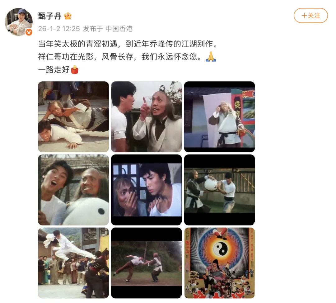 甄子丹发文悼念:当年笑太极的青涩初遇,到近年乔峰传的江湖别作。祥仁哥功在光影,风骨长存,我们永远怀念您。一路走好。