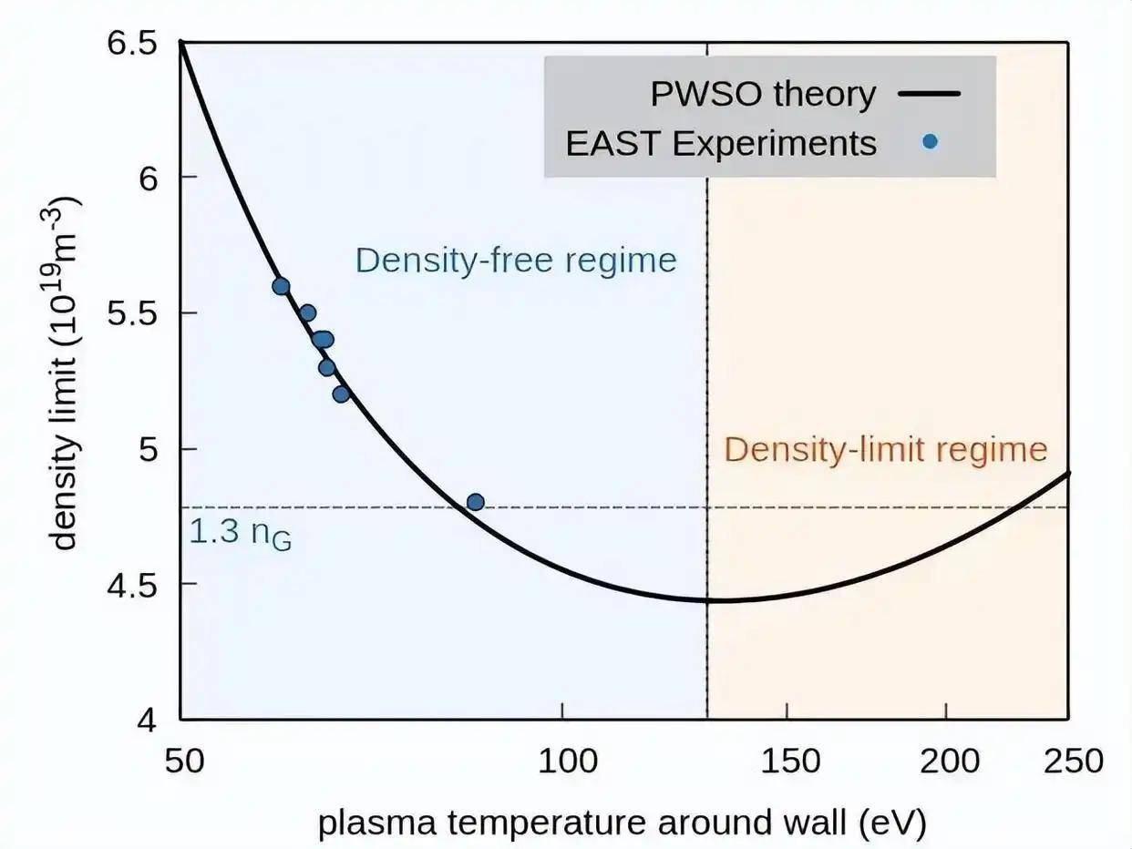 光缓解还不够,团队还要主动突破极限。他们通过调控装置靶板的物理条件,减少了靶板上钨杂质带来的物理溅射——钨是托卡马克装置常用的材料,杂质溅射是之前难以避免的问题。在一系列精准调控下,等离子体成功突破了之前的密度极限,进入了一个全新的“密度自由区”。更关键的是,实验结果和之前PWSO模型的预测高度吻合,这就彻底证实了这个新区域的存在,也证明了团队提出的理论模型是完全正确的。