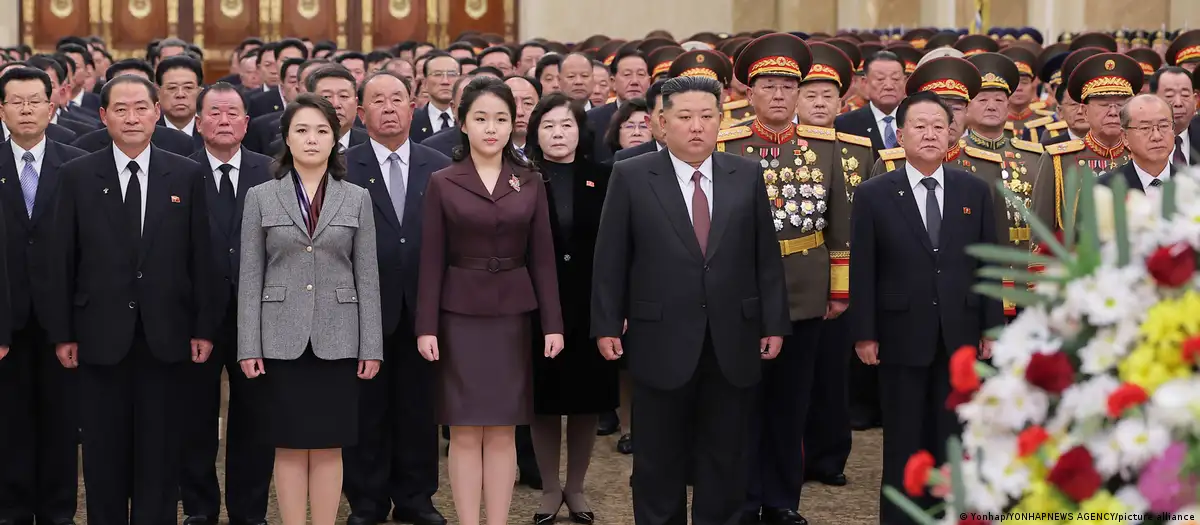 朝鲜最高领导人金正恩的女儿金主爱首次公开拜谒家族陵墓,而且站在前排正中央。图像来源: Yonhap/YONHAPNEWS AGENCY/picture alliance