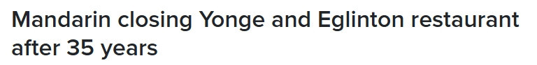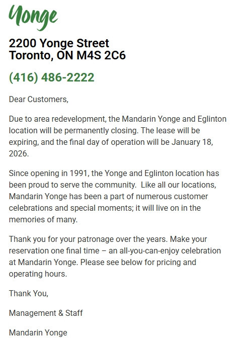 管理层写道:“由于周边地区的重建开发,Mandarin Yonge and Eglinton分店将永久关闭。”并补充说,这家餐厅30多年来一直以服务社区为荣。