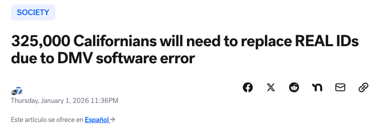 据1月2日报道,由于加州机动车辆管理局(DMV)系统出现技术错误,约有32.5万名加州居民需要更换其REAL ID。