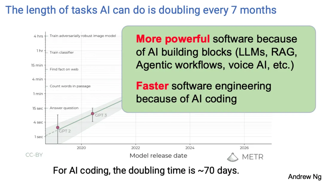 在把话筒交给 Lawrence 之前,我有两张幻灯片和另一个想法想分享。现在的感觉真的是构建 AI 应用和在 AI 领域建立职业生涯的最佳时机。几个月前,我知道在社交媒体和传统媒体上,有一些关于“AI 发展是否正在放缓”的疑问。有人说,“GPT-5 真的有那么好吗?”我认为它其实相当不错,但关于 AI 进步是否放缓的问题确实存在。我认为这个问题被提出的部分原因在于,如果 AI 的基准是 100% 的完美答案,那么如果你进步神速,在某个时间点你也无法超过 100% 的准确率。
