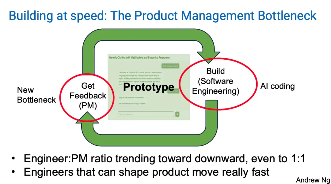 我在硅谷和许多科技公司看到了一些奇怪的趋势。人们经常谈论工程师与产品经理(Engineer-to-PM)的比例。你要对这些比例持保留态度,因为它们到处都是,但你听到公司谈论的比例大约是 4:1,7:1 或 8:1。这种观念是一个写产品规范的产品经理可以让 4 到 8 个工程师忙碌起来。但因为工程速度在加快,而产品管理并没有被 AI 像工程那样加速那么多,我看到工程师与 PM 的比例正在下降,甚至可能到了 2:1 或 1:1。我合作的一些团队,提议的人员配置甚至是 1 个 PM 对应 1 个工程师,这与几乎所有传统的硅谷公司都不一样。