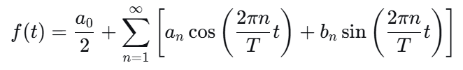 泰勒提出用泰勒级数来等价表示某个函数,同样地傅里叶也提出傅里叶级数来表示某个函数。不过傅里叶级数针对的是周期性函数,它的核心思想是通过一系列不同频率的正弦函数和余弦函数的线性组合来表示任意周期性函数。对于周期为T的函数f(t),可以通过图中的公式表示。可以看到原函数f(t)被无数个cos函数和sin函数等价表示,为什么要做这样的等价表示呢?肯定不是因为傅里叶无聊啊,而是因为原函数比较复杂,转化为傅里叶级数后能大大简化问题。